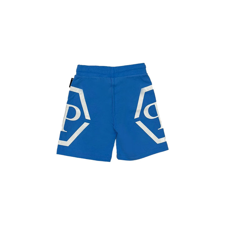 Blue bermuda shorts in fleece with brand logo, leather applications, solid color with print, french terry lining, multipockets, wash at 30? c, do not dry clean, do not bleach, do not tumble dry, iron at 110? c max, contains non-textile parts of animal origin.