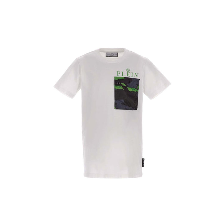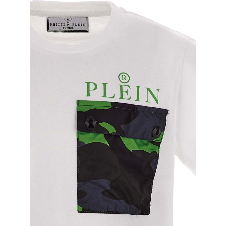 Camouflage-print short-sleeved T-shirt from Philipp Plein Junior featuring jersey knit, camouflage print, logo print at the chest, chest flap pocket, crew neck, short sleeves, straight hem, white/green and cotton.