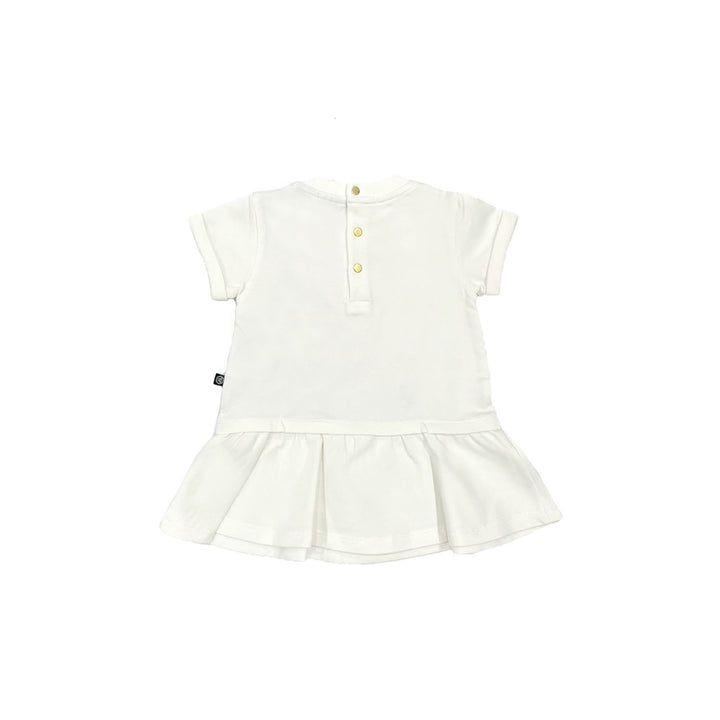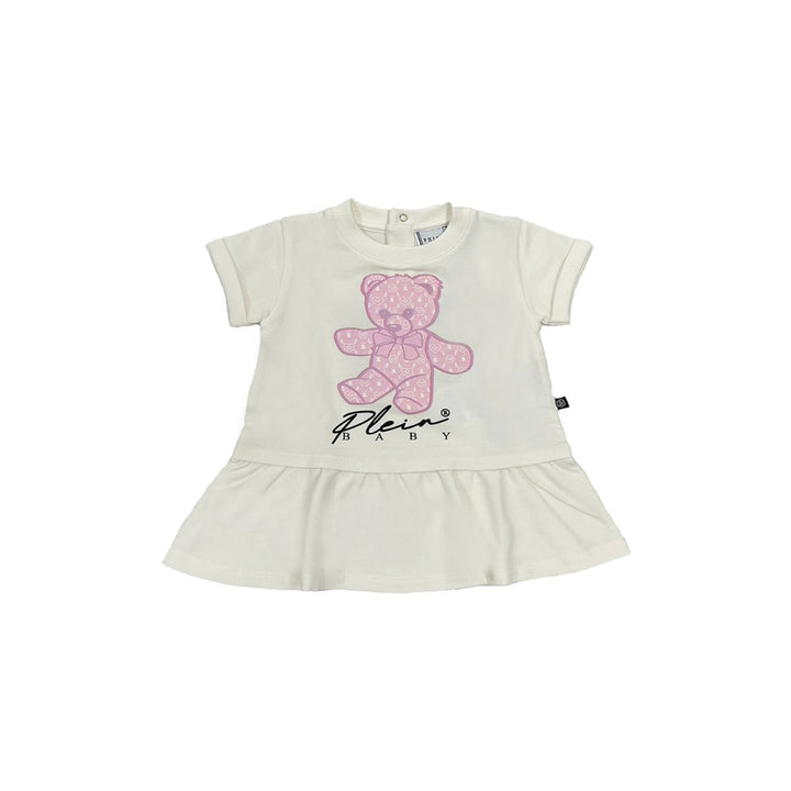 Graphic-print cotton dress from PHILIPP PLEIN featuring white, stretch-cotton, jersey knit, graphic print to the front of a pink teddy bear and a crew neck, short sleeves and peplum hem.