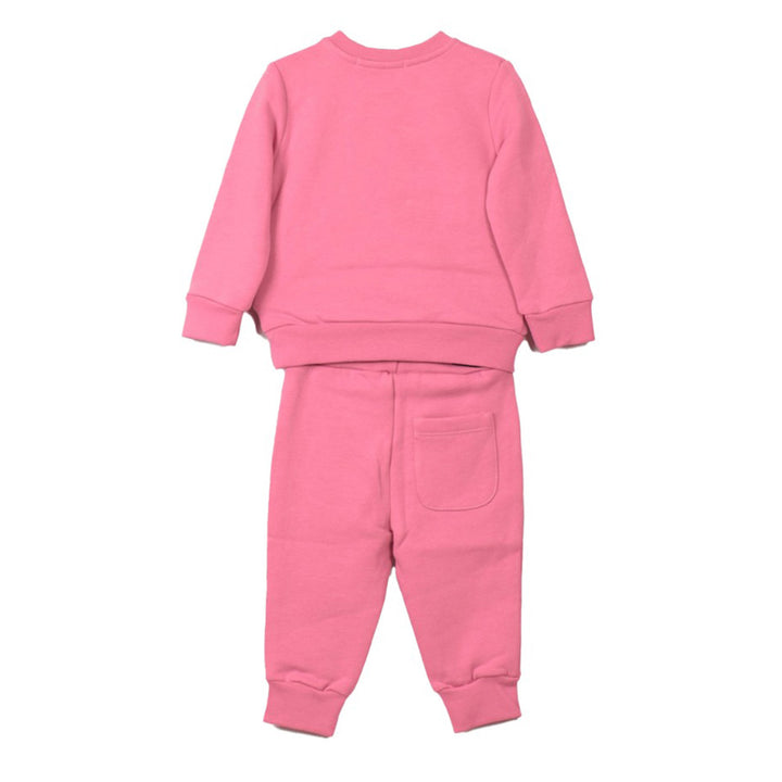 Pink tracksuit for little boys and girls by MSGM, made in soft cotton jersey with a cosy fleece feel inside. The top has popper fastenings on one shoulder and a white box logo print on the chest. The joggers have a comfortable elasticated waistband,