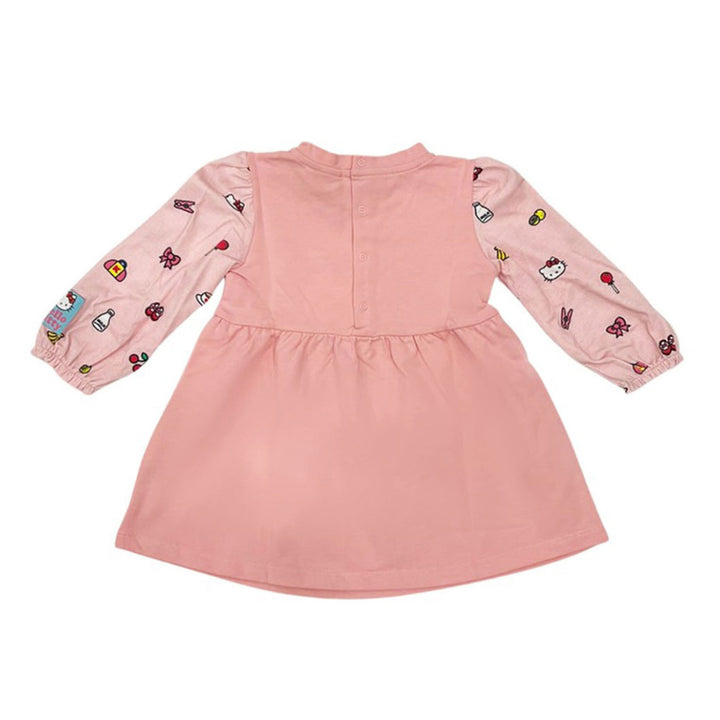 Pink brushed cotton dress with long sleeves, ribbed crew neck and hem and clip closure on the back. It is embellished with embroidered fuchsia logo on the chest, Hello Kitty on the front and colorful designs on the sleeves.