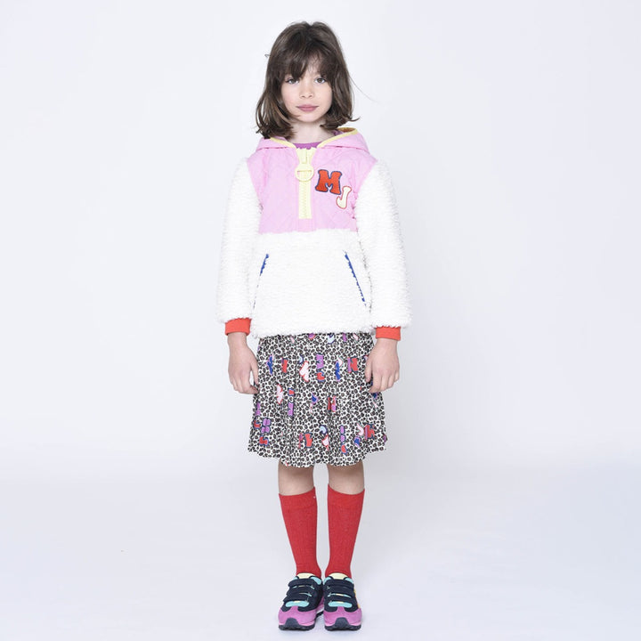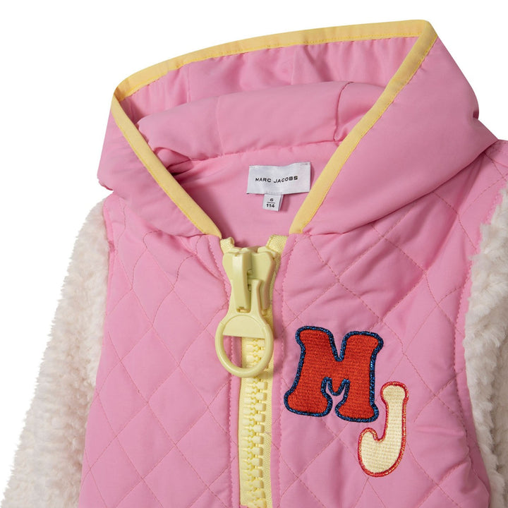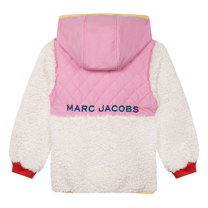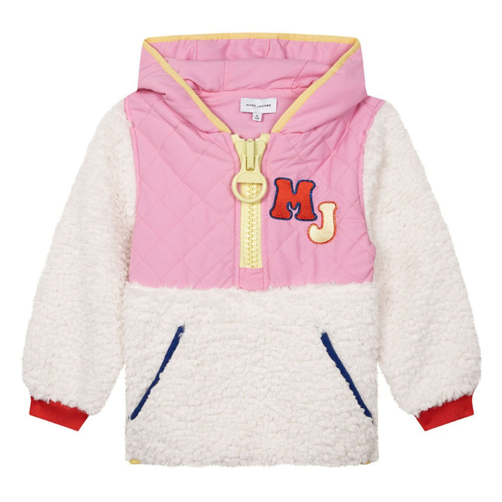 Girls ivory and pink Hoodie by MARC JACOBS. The white borg fleece is soft and fluffy and there is contrast pink quilted details at the chest with MJ logo embroidery. The top fastens with an oversized yellow zip and there are side pockets with blue tr
