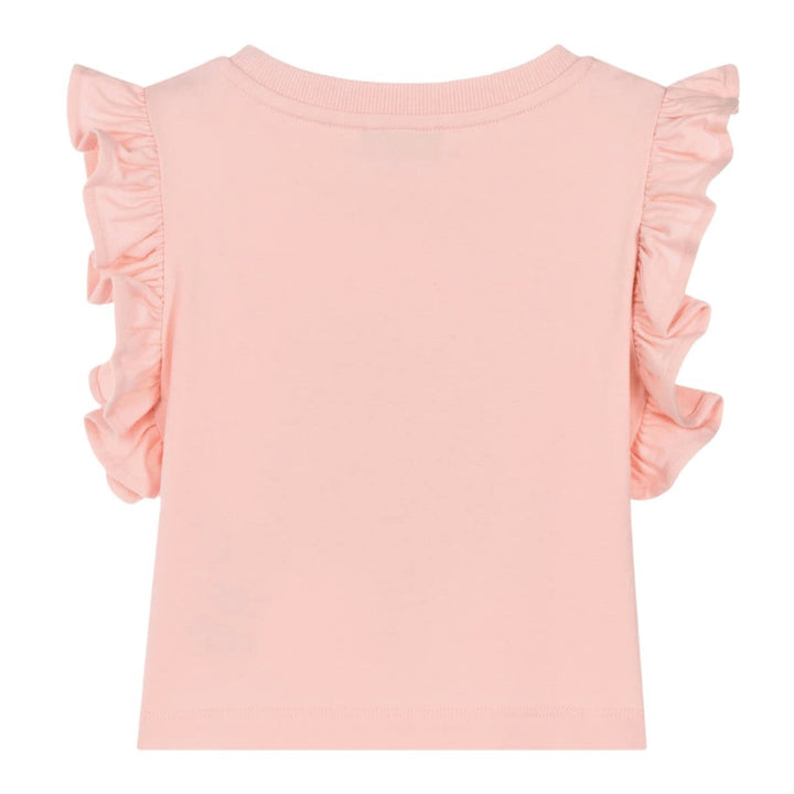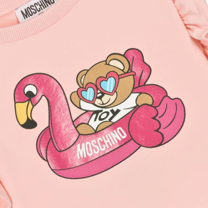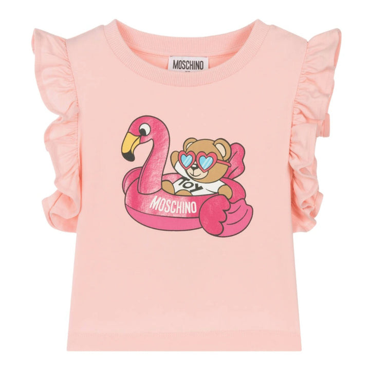 Pink marl cotton Top for girls, unmistakably by luxury Italian brand Moschino Baby. The iconic Moschino Teddy Bear is printed on the front of both pieces, climbing the designer's bold, black logo. The Top is made in soft, comfortable jersey and fast