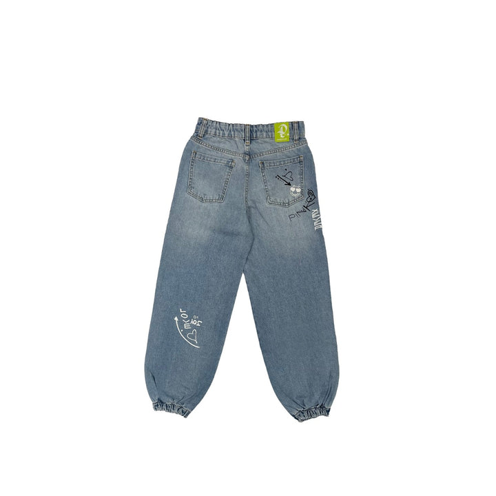 Light blue denim jeans for girls, made in soft stretch denim. Adding a cute touch, they are embroidered with teddies and logos in pink, beige and gold. The relaxed straight fit keep these jeans on-trend, whilst the pockets on the front and back provide useful storage for your belongings. The waistband is adjustable for a good fit and they fasten with a zip and branded button. It has different types of doddle all over the jeans.