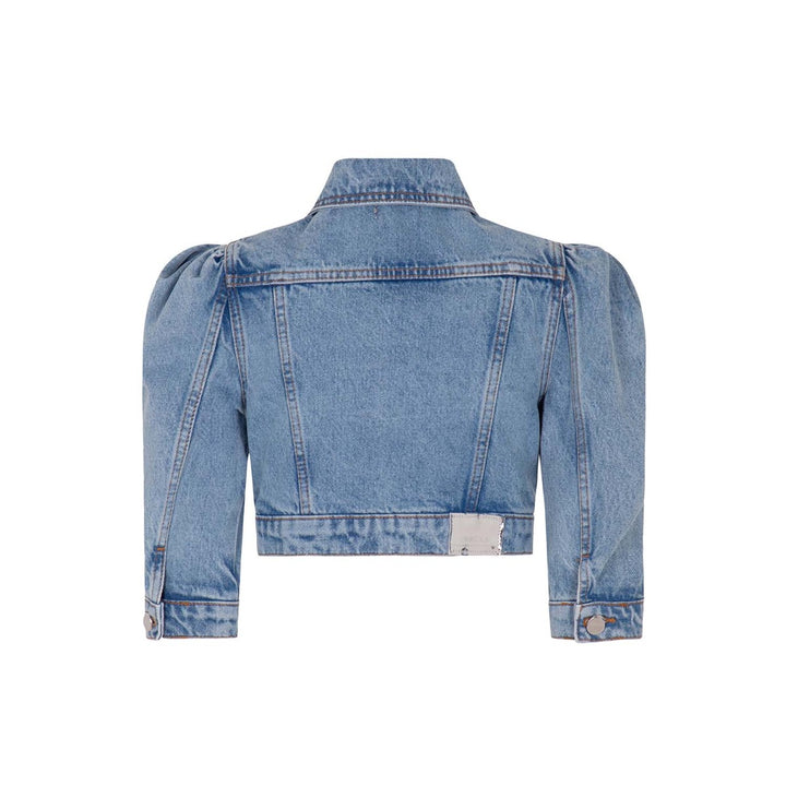 Girls light blue denim jacket with cropped style and high-oversized shoulders. It features silver metallic logo buttons.