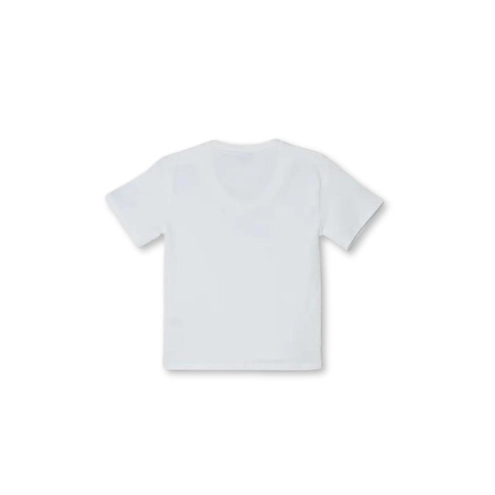 Girls bubble white cotton t-shirt with logo made of rhinestones and studds.