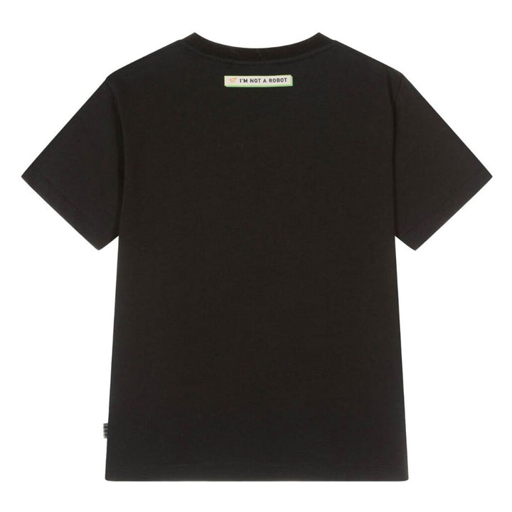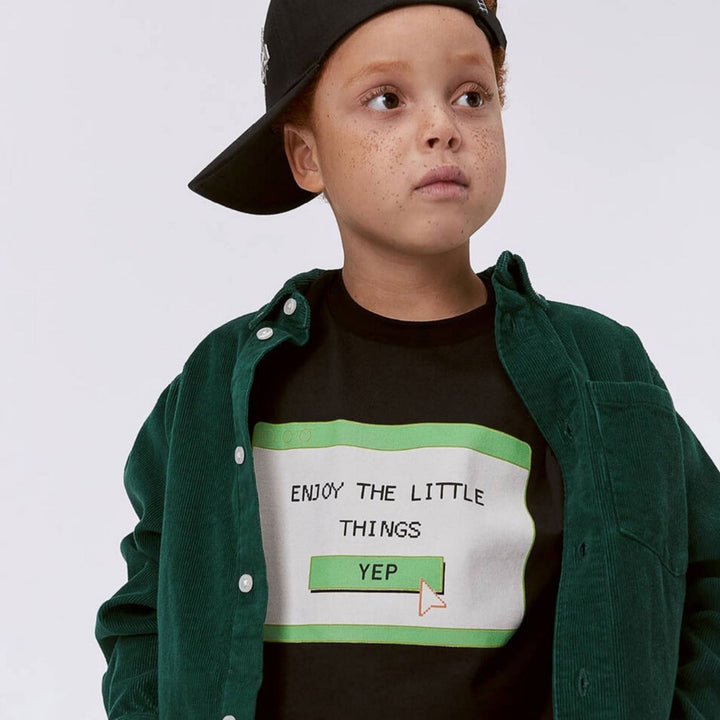Zwart t-shirt met op de voorkant een retro computerprint. De print is een groene print van een startvenster op de computer die vraagt om op "Ja" te klikken om van de kleine dingen te genieten. Dit t-shirt is van 1% biologisch katoen en heeft een rond