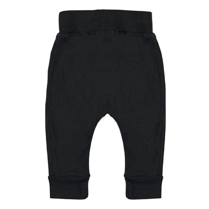 Sammy is a pair of black baby trousers. They have a wide elastic rib at the waist and legs and visible stitching in the front that gives them a sweatpants look. This Molo product is GOTS certified organic, which means that it is made with certified o