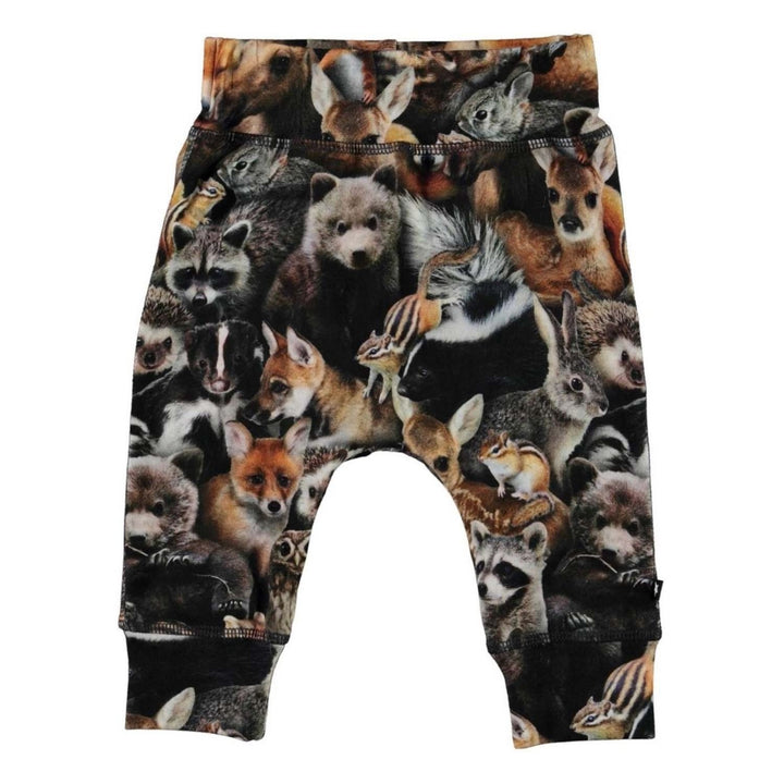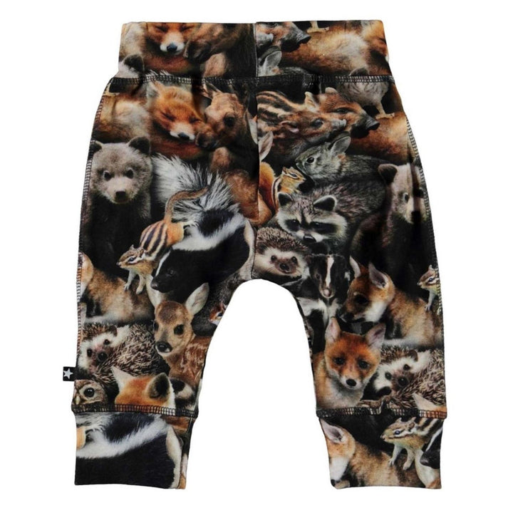 Sammy is a pair of brown baby trousers with a print of animals of the forest. They have a wide elastic rib at the waist and legs and visible stitching in the front that gives them a sweatpants look.This Molo product is GOTS certified organic, which m