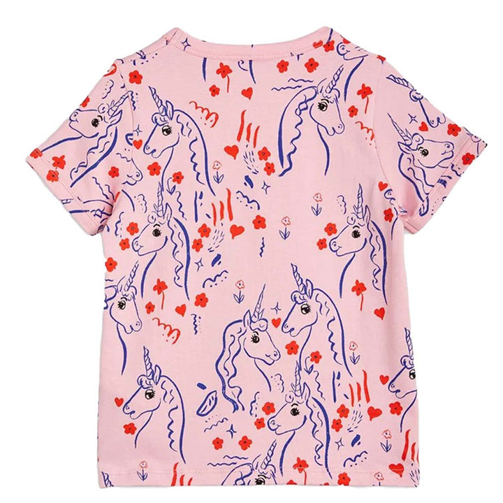 Pink T-shirt with Scottish Unicorns artwork, made from GOTS certified organic cotton with a hint of stretch. The T-shirt has contrasting bindings at the neck and sleeve ends and is designed for a slim fit.