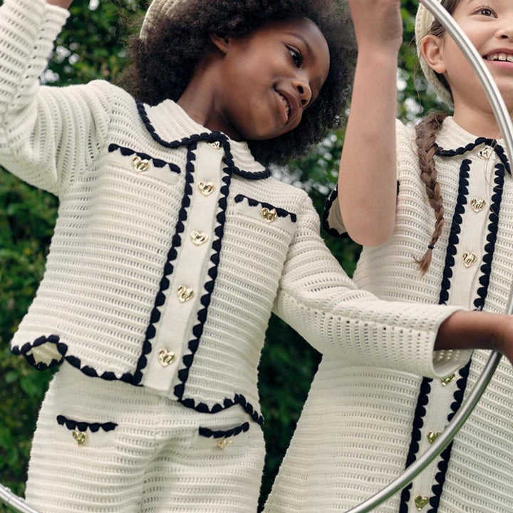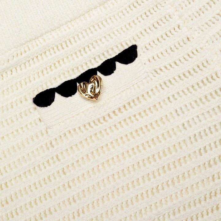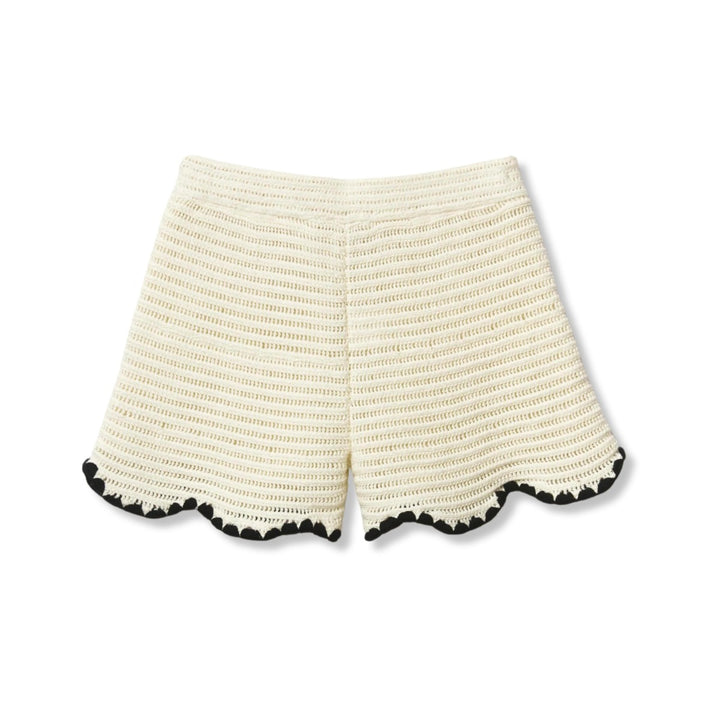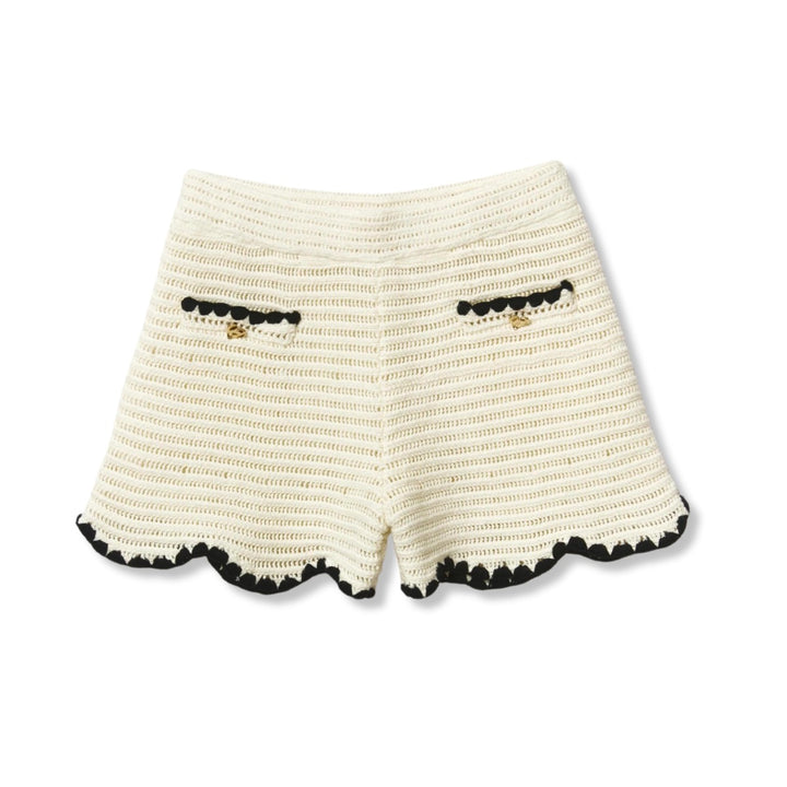 A cute summer staple, these cream crochet shorts are decorated with navy contrast trims and gold heart buttons for extra shine. Show off the scalloped hem with sandals for a happy holiday look.