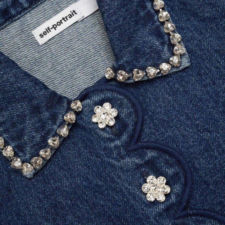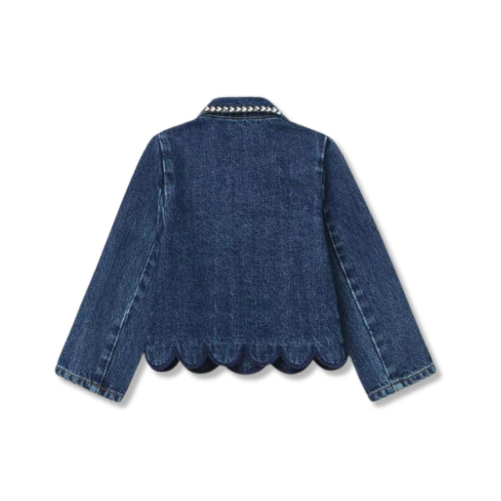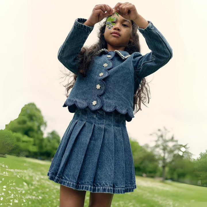 Bring a sassy edge to mini me's wardrobe with this denim jacket topped with diamanté trim and flower buttons. A scalloped hem brings extra charm – style with the matching skirt for a total look.