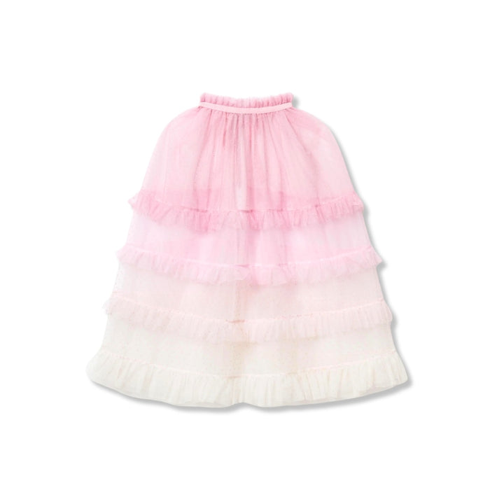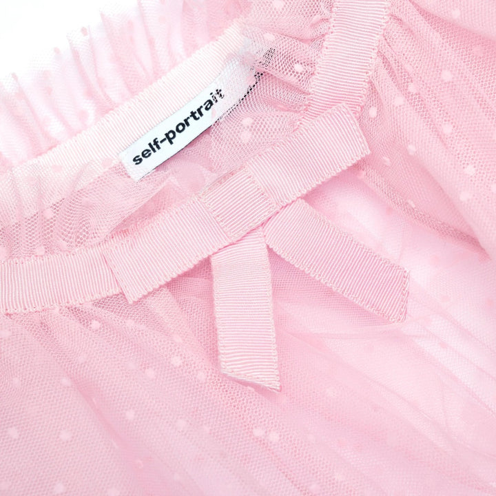 A beautiful pink cape for girls by Self-Portrait, made in fine tulle for a lightweight feel. A great addition to any special occasion outfit, this lovely piece has an ombré finish, gradually changing from pink to white at the hem. Delicate pink polka dots can be seen throughout the fabric and feminine ruffles add texture all around. There is a pink grosgrain trim on the neckline with a decorative bow and a popper fastening.