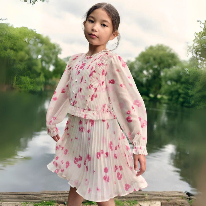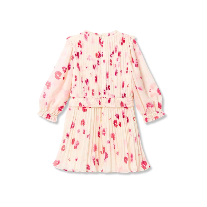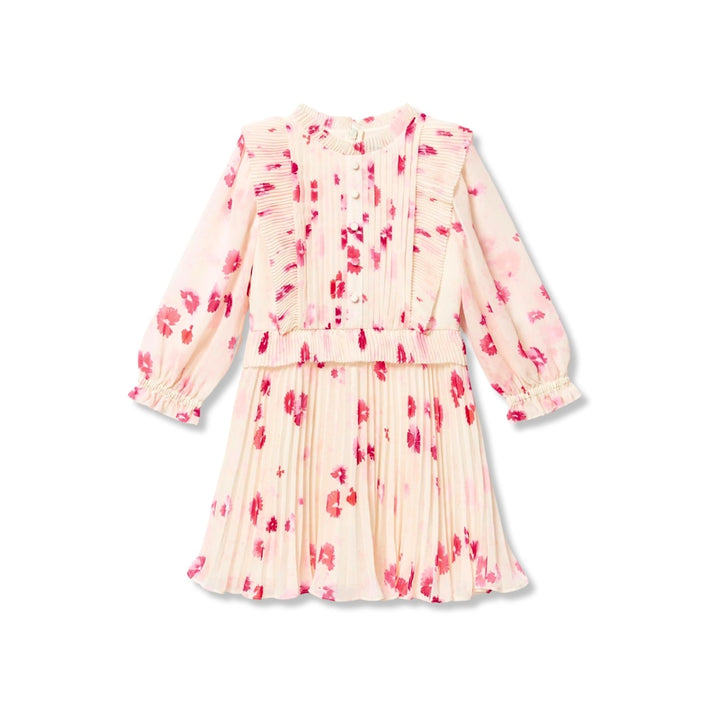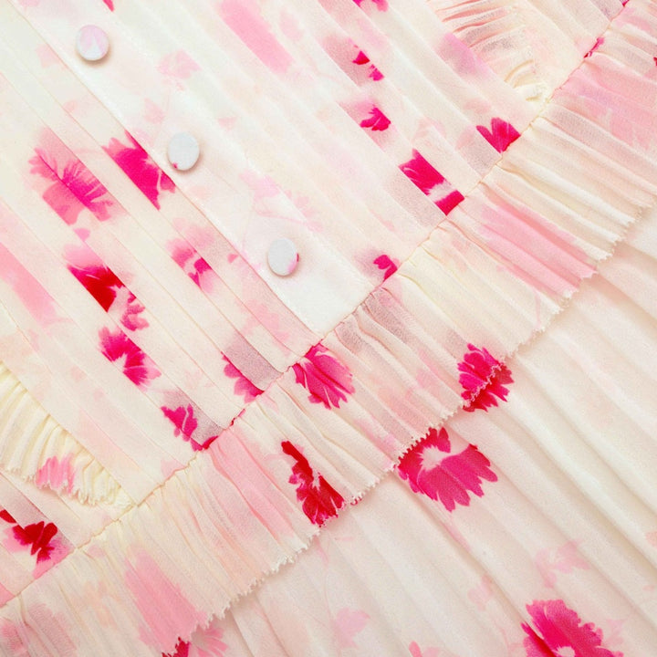 A pink floral print brings a feel-good attitude to this cream chiffon dress. Romantic details come courtesy of a pleated skirt with ruffle details. Pair with ballet flats for al fresco parties.
