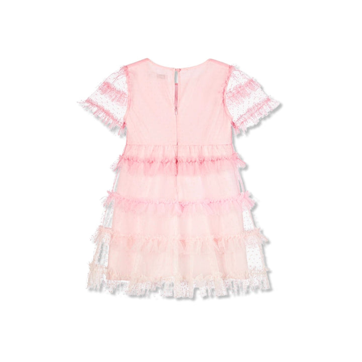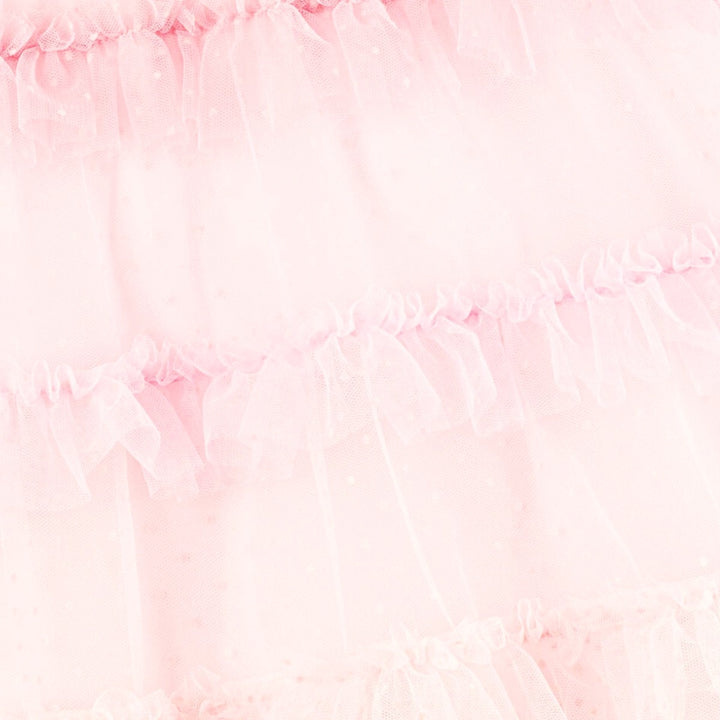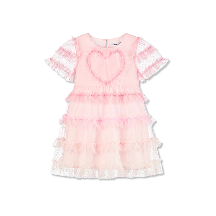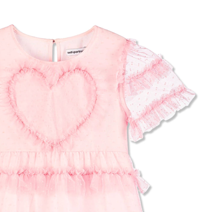 Light pink special occasion dress for girls by Self-Portrait, beautifully characterised by ruffles. Made in fine tulle with delicate pink polka dots, this lovely style has a round neckline, sheer short sleeves, and an oversized heart motif on the front. The dress has a silky smooth lining and fastens with both a keyhole button and a concealed zip on the back.