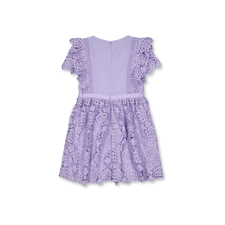 Lace dress for girls from Self-Portrait Kids in lilac. The flared model is given special moments thanks to the floral lace finish, while decorative decorative trims in combination with various frill details guarantee a romantic guarantee a romantic character