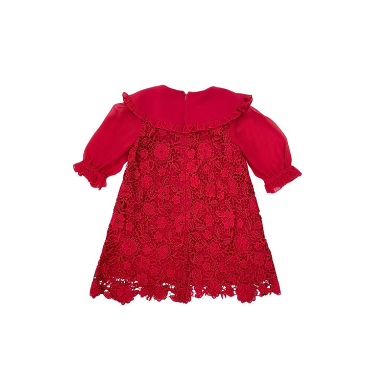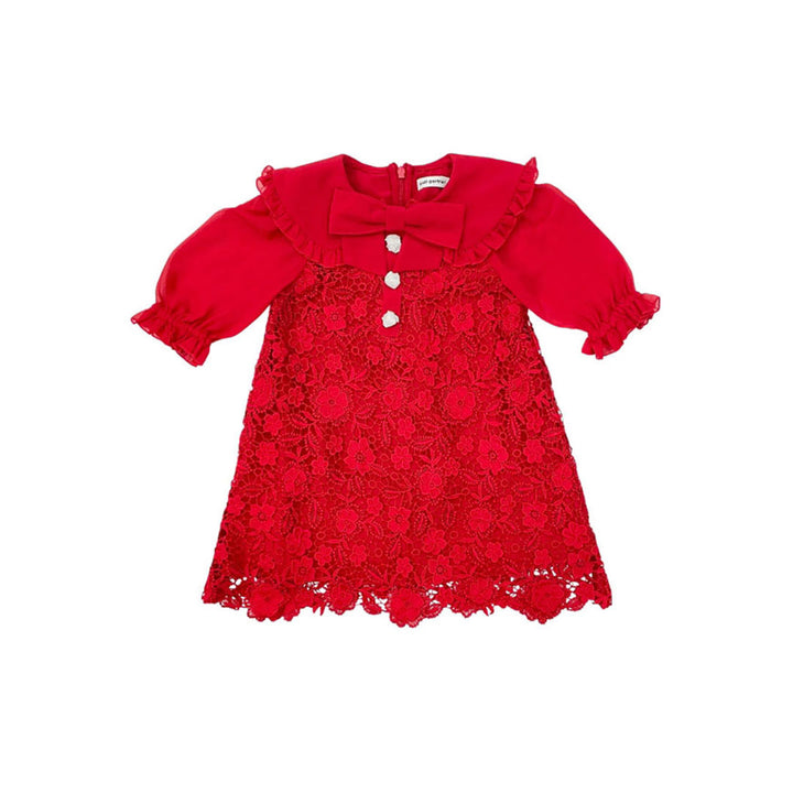 Red Guipure Lace Mini Dress By Self Potrait With A Pricess Look On The Neck And A Nice 3D Effect With Bow In The Middle. The Full Sleeves Is A Tulle Cloth. It Is A Perfect Christmas Carnival Dress.