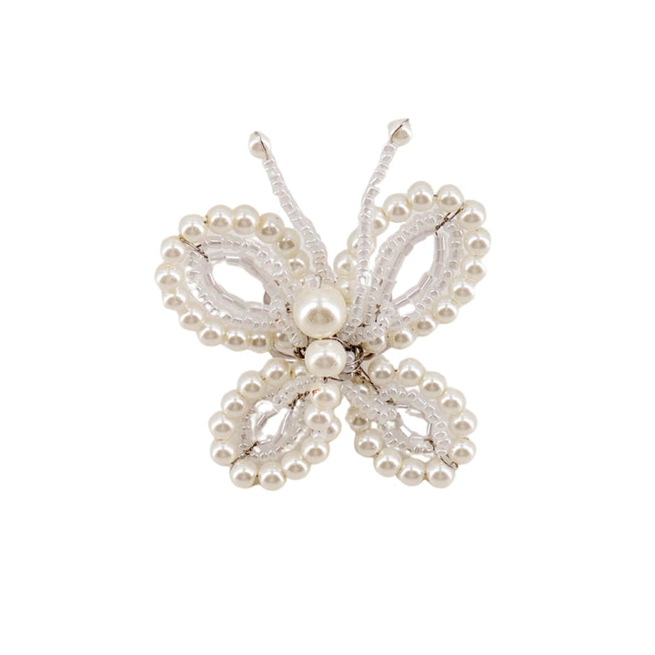 This stunning ring is completely hand made. It is in the shape of a butterfly which is hand threaded with dozens of ivory pearl beads of different sizes and tones with a centre of clear cut crystals for extra sparkle. The ring itself is silver plated and completely adjustable to fit any finger size. This style comes in its own Sienna Likes to Party branded drawstring pouch for safe keeping.