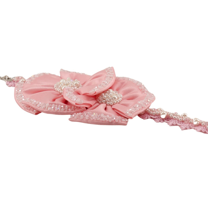 Our Statement designer girls bracelet called the Florian has two statement handmade satin flowers in pink one slightly larger than the other. Each flower has hand-stitched mini soft white crystals around its edges. This stunning luxury jewelry bracelet has a embellished centre with varying sizes soft white faux pearl beads and cut crystal beads.This bracelet is fully adjustable. A perfect style for the bridal party or for all other special occasions. Each piece comes in a branded Sienna Likes To Party gift pouch for safe keeping.