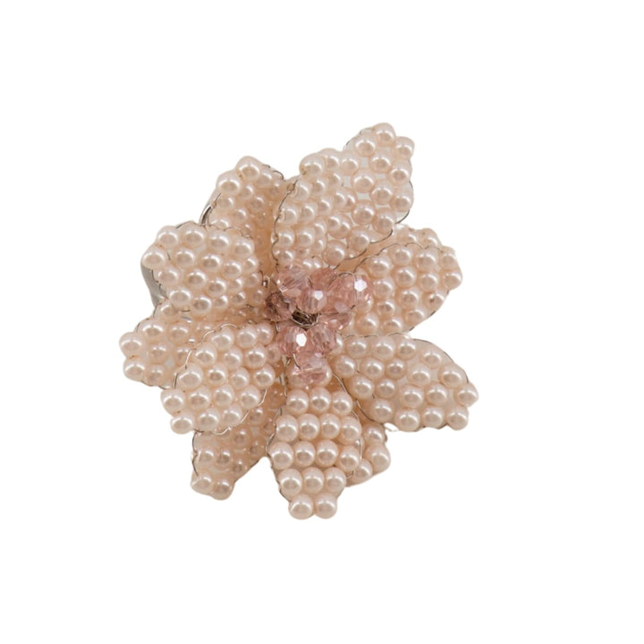 This stunning girls designer ring is entirely hand made with gorgeous dozens of pale pink pearl beads. The beads are hand threaded together to create a magnificent wild flower that truly makes a statement. The center of the flower has added elegance with its hand threaded pink cut crystal beads. The silver plated ring is completely adjustable to fit any finger. This piece comes in its own Sienna Likes to Party drawstring pouch for safe keeping.