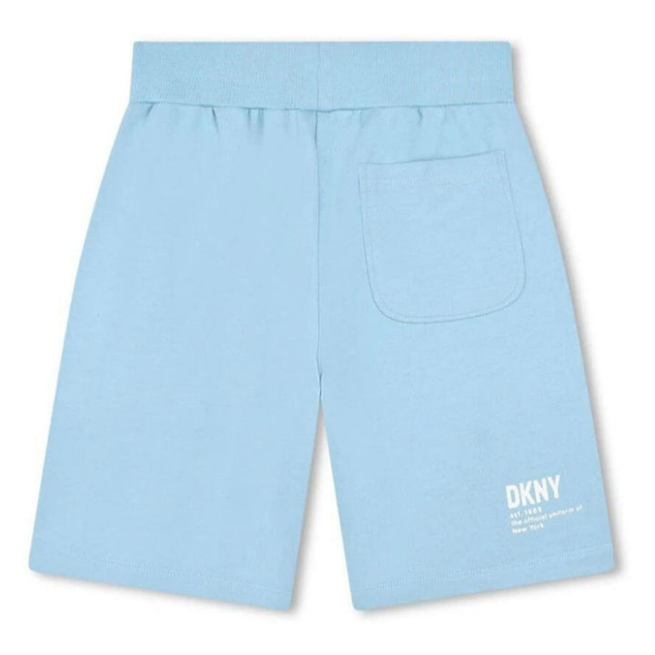 Casual and comfortable, sku blue shorts for boys and girls by American brand DKNY. They are made in soft, mid-weight cotton jersey with a ribbed, wide elasticated waistband. An eye-catching white logo is embroidered on the front and a printed one can