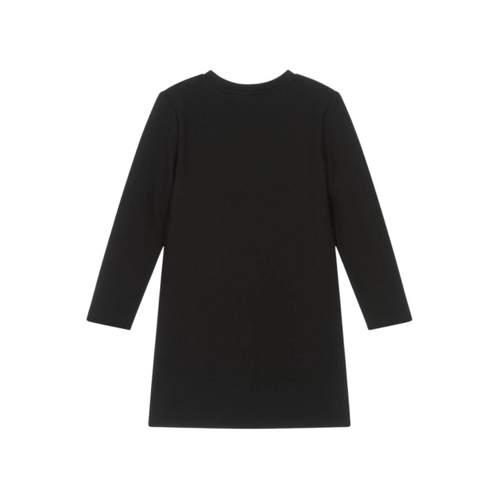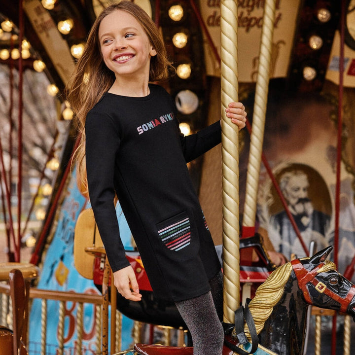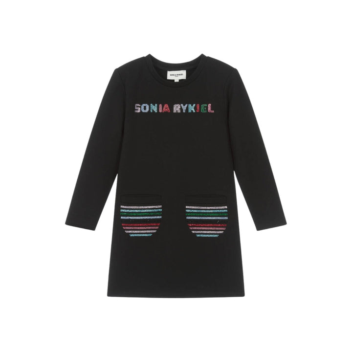A black dress for girls by Sonia Rykiel Paris, knitted in the softest viscose Milano jersey. It has a sparkly colourful diamanté logo decorated on the front, with matching stripe pockets for a casual glam look.
