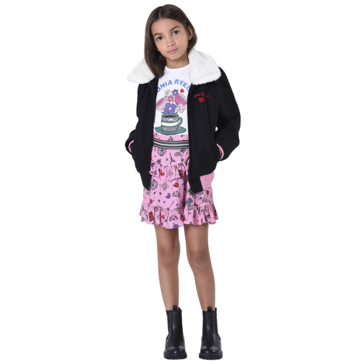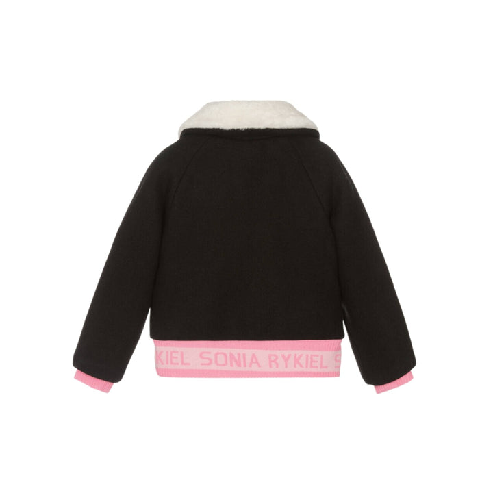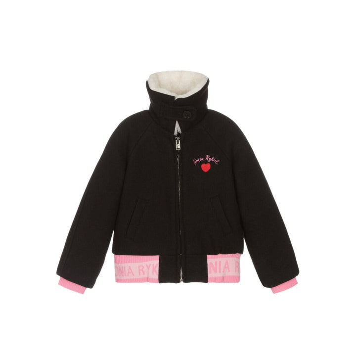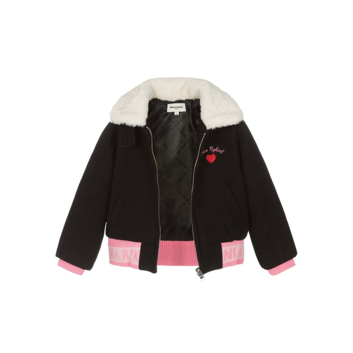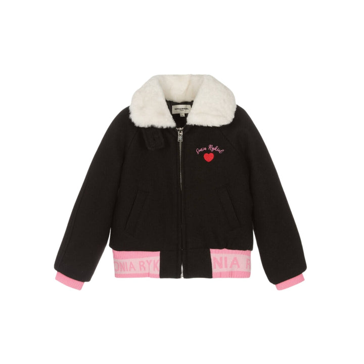 A cute black bomber jacket for girls by Sonia Rykiel Paris, made from a soft felted wool blend. This layering piece has a love heart motif embroidered on the chest, with a stretchy ribbed logo-jacquard waistband for an eye-catching look. The ivory faux fur collar can be buttoned-up to keep the neck and face cosy. It zips-up and has pockets on the front.