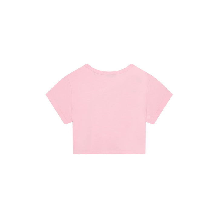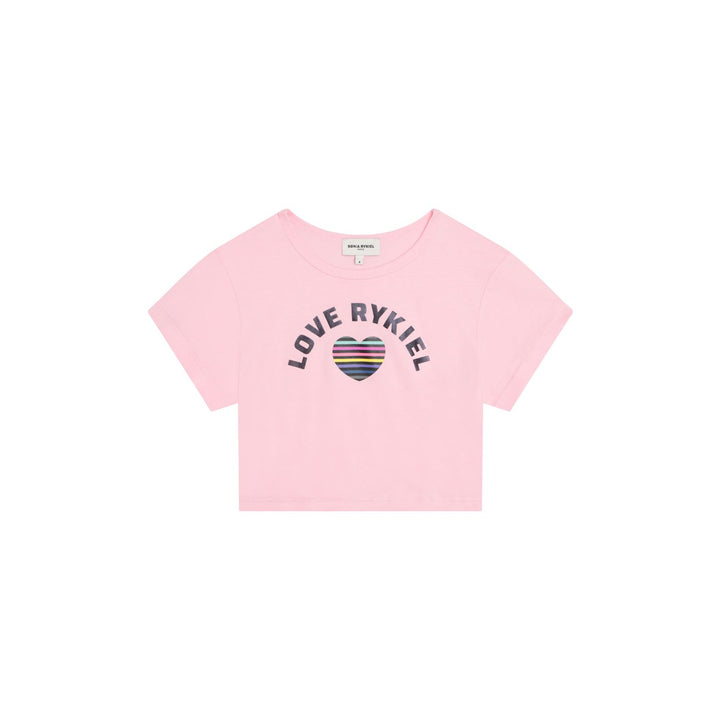 Girls Pink logo-print cropped Top from SONIA RYKIEL ENFANT featuring washed, pink, cotton, jersey knit, logo print at the chest, heart motif, round neck, short sleeves, straight hem and cropped