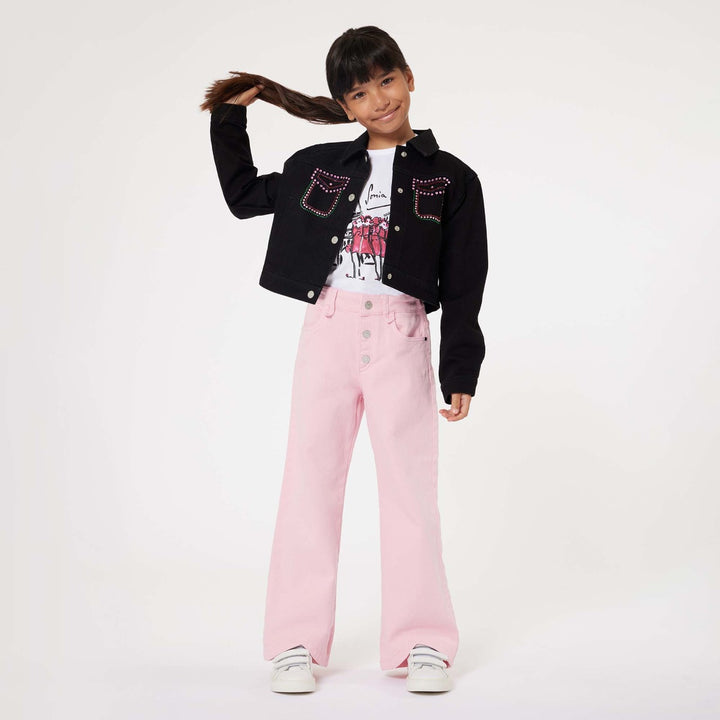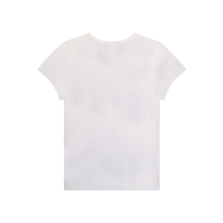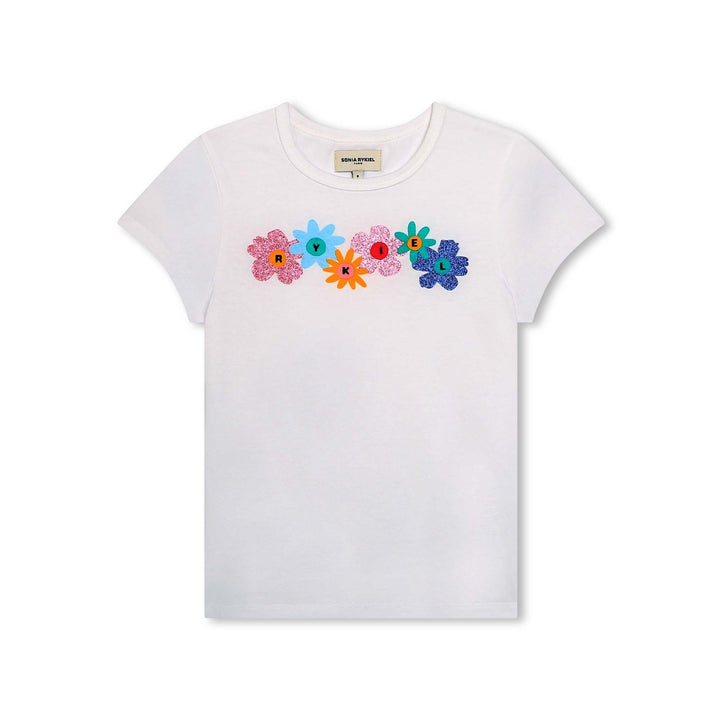 Girls white organic cotton T-shirt by Sonia Rykiel Paris, made in soft, comfortable jersey with a boxy fit. In the brand's playful style, this short-sleeved top has a colourful floral motif on the front, with glitter details for a sparkly touch.