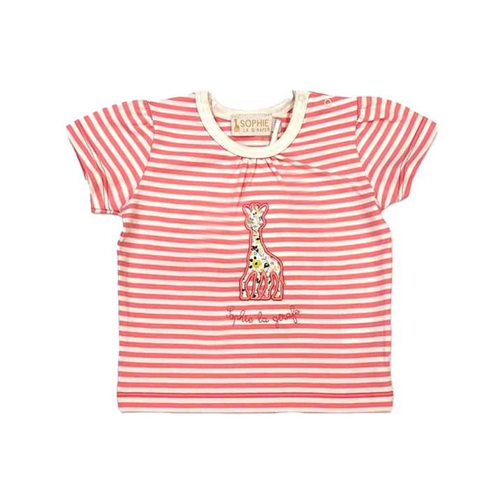 Pale pink stripped top for baby girls, by Sophie la Girafe. Made from soft cotton jersey, it has a multicolor Sophie la Girafe print on the front.