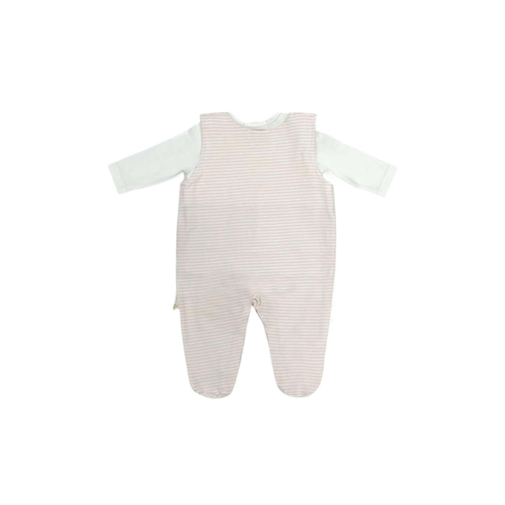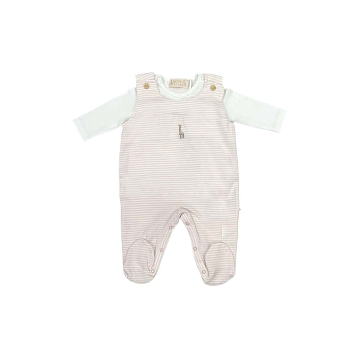 White and pink stripped dungarees set for girls by Sophie la Girafe, made in soft and stretchy cotton jersey. The white top has popper fastenings on the back and the pink stripped dungarees have button fastenings on the shoulders and side. There are sweet Sophie la Girafe embroidered details on front piece.