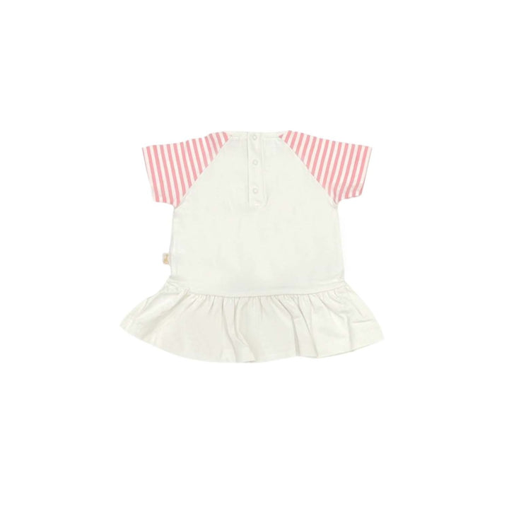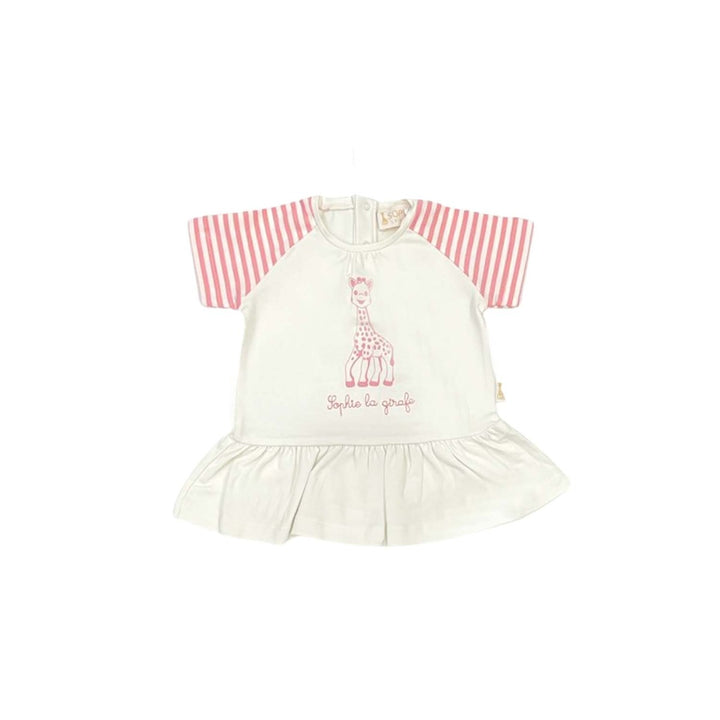 White dress for baby girls by Sophie la Girafe, made in soft and stretchy cotton jersey. The plain white skirt has a ruffle trim around the waist and there is a cute Sophie la Girafe Paris themed print on the front of hem with a pink embroidered logo. It fastens with poppers on one the back of hem.