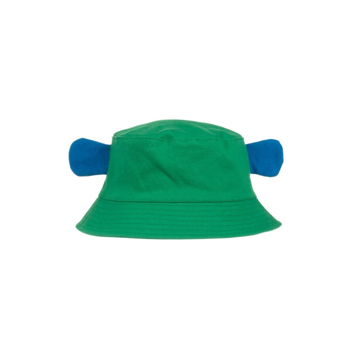 A green and blue bucket hat for baby boys, by Stella McCartney Kids. Made in the softest organic cotton twill, this lightweight hat will keep your child safely shaded from the sun. It has a cheeky blue money on the front, topped with little ear appliques on the head. The Stella McCartney fit can be quite small so choose a size up if you want room to grow.