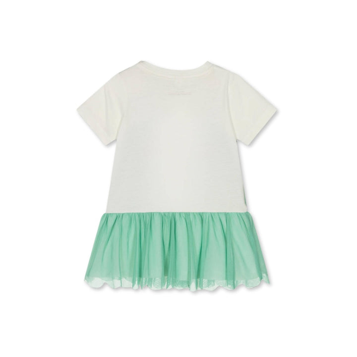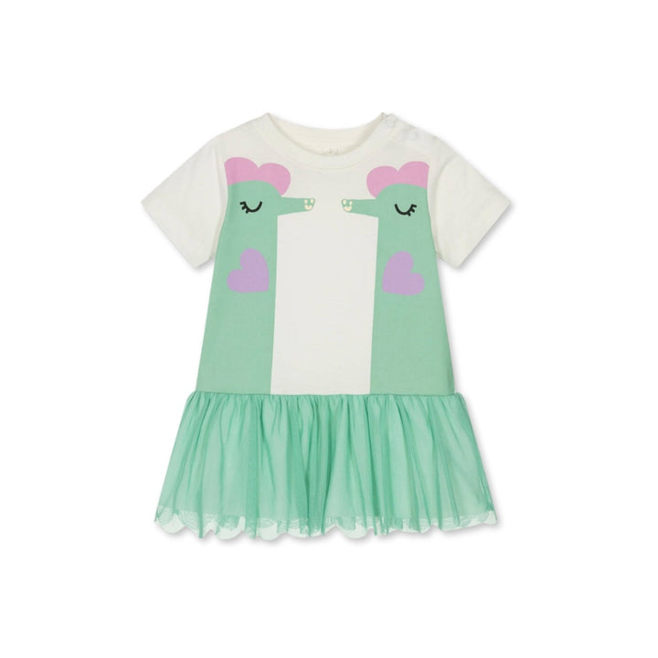 Off-white dress for little girls by Stella McCartney Kids, made in soft and stretchy organic cotton jersey. This fun design has cute green and pink seahorses printed on the front. It has a dropped waist and ruffle skirt with a green mesh overlay, which has a pretty scalloped edge. This casual dress has popper fastenings on one shoulder for easy dressing. The Stella McCartney fit can be quite small so choose a size up if you want room to grow.