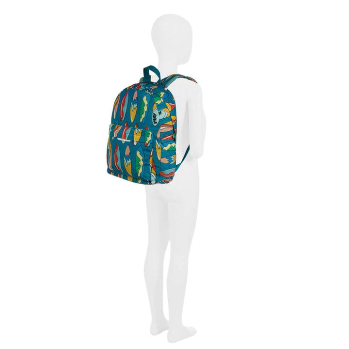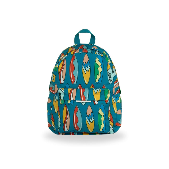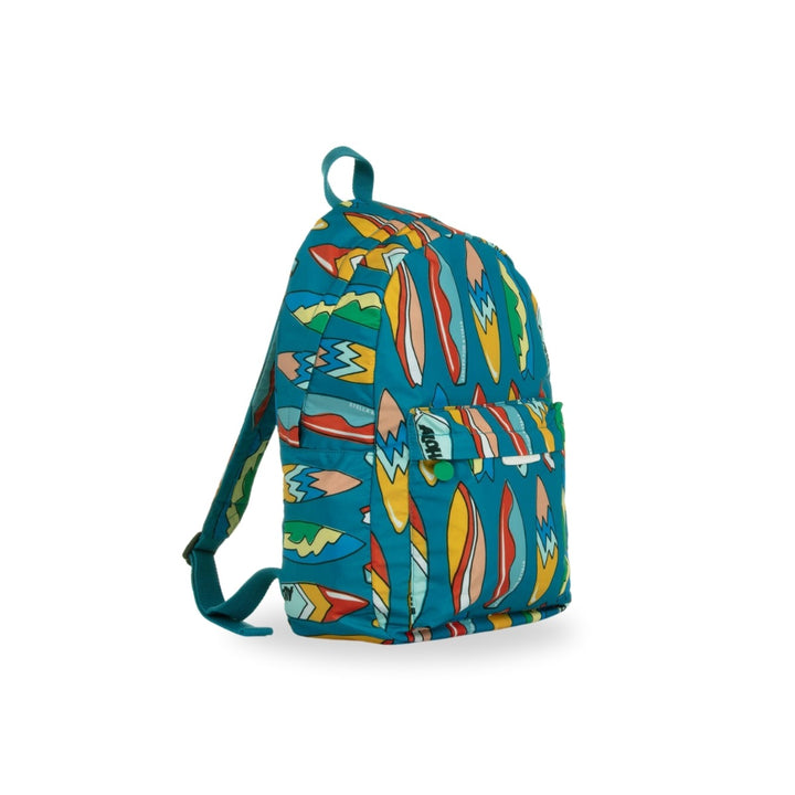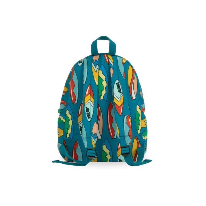 A teal blue backpack for boys by Stella McCartney Kids, patterned with a fun and colourful Aloha surfboard print. Silky smooth and lightweight, this practical bag has a spacious main compartment and a pocket on the front, both with the signature medallion logo puller on the zips. The adjustable shoulder straps are gently padded for comfort and there is a small carry handle. For added designer elements, there is a white faux leather logo tab on the front.