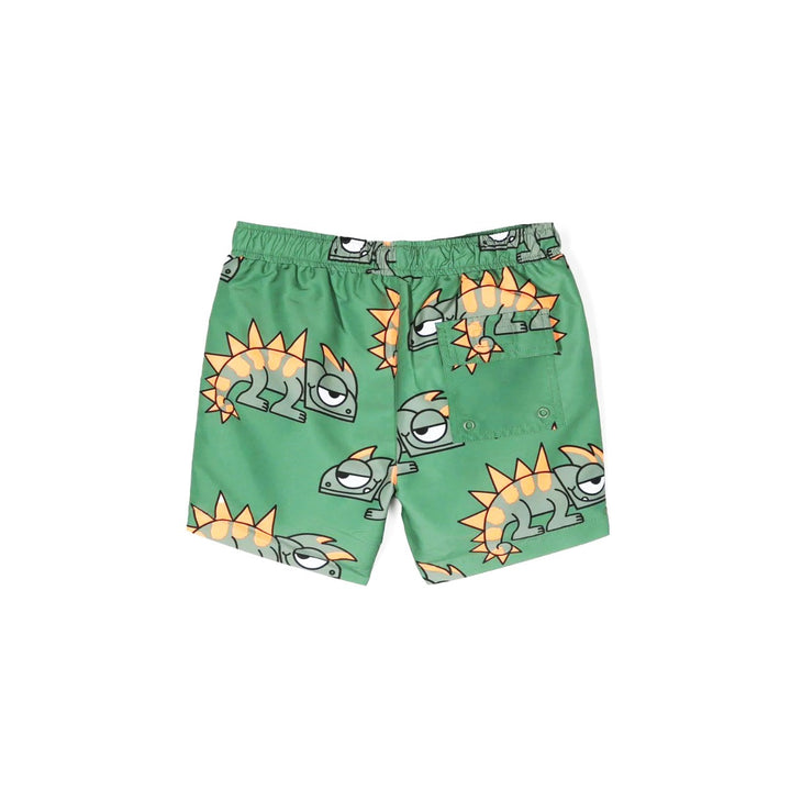 Cool, khaki green swim shorts for boys by British brand Stella McCartney Kids, with a fun gecko pattern in green and neon orange. Environmentally friendly, the silky smooth fabric is made from recycled sources with a comfortable, soft mesh lining. Come with a useful storage pouch, they have an elasticated waistband with a neon orange drawstring, two front pockets and a velcro-fastening back pocket.