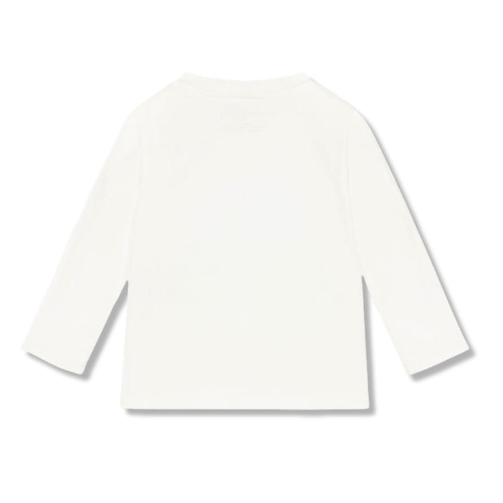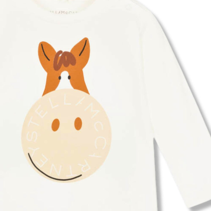Ivory top for little boys by Stella McCartney Kids, made in soft organic cotton jersey for comfortable wear. This long-sleeved style has a brown horse print on the front, incorporating the sustainable designer's circular logo. It has a gently ribbed neckline and popper fastenings on one shoulder for easier dressing. The Stella McCartney fit can be quite small so choose a size up if you want room to grow.