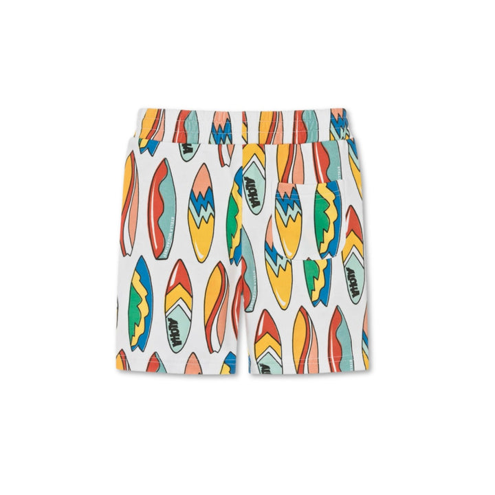 Cool white shorts for boys by Stella McCartney Kids, with a vibrant and colourful surfboard print. Made from soft, mid-weight organic cotton jersey, these comfortable shorts are sure to brighten casual days. Easy to wear, they have an elasticated waistband and useful, concealed side pockets with a patch pocket on the back. Completing the look, they have fun 'Aloha' prints and subtle logos within the pattern. The Stella McCartney fit can be quite small so choose a size up if you want room to grow.