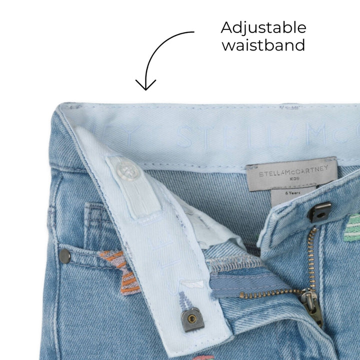 Washed blue denim shorts for girls by British designer, Stella McCartney Kids, made with cotton. A warm weather wardrobe staple, they are embroidered with striped bows in pink, red and green for a playful touch. They have classic five pocket styling, with branded metalware and secure with a zip and hook fastening. The waistband is adjustable for a great fit and they have a logo patch on the back for a discreet designer finish. The Stella McCartney fit can be quite small so choose a size up if you want room to grow.