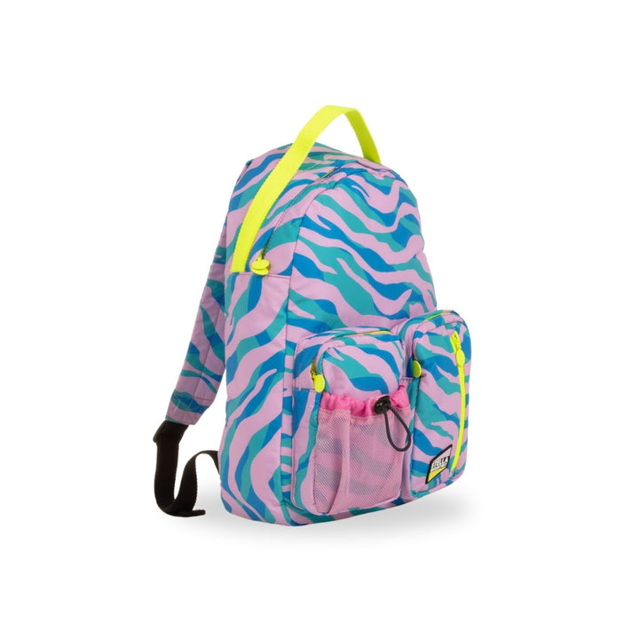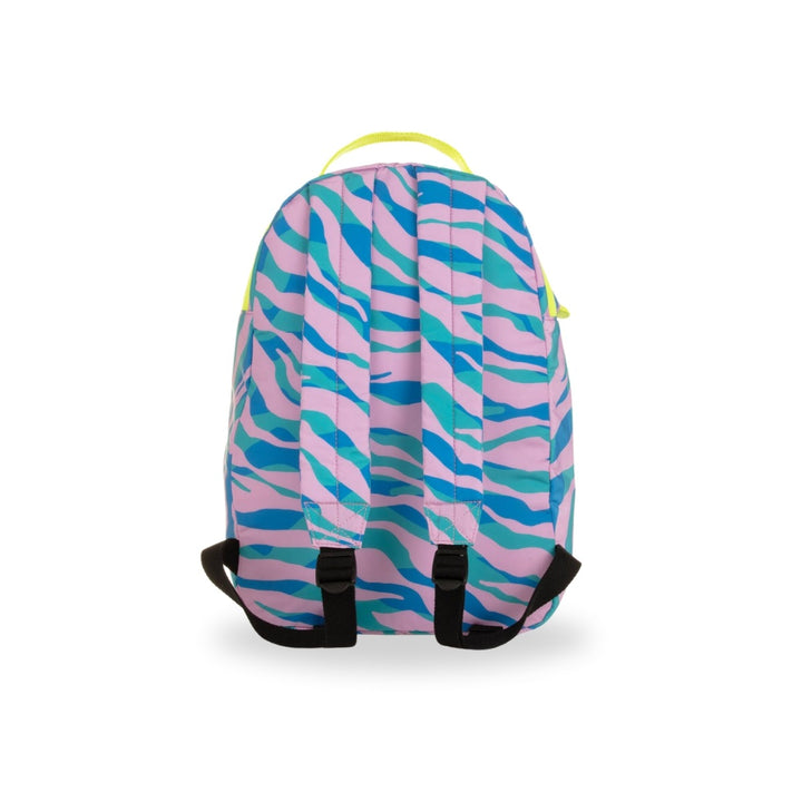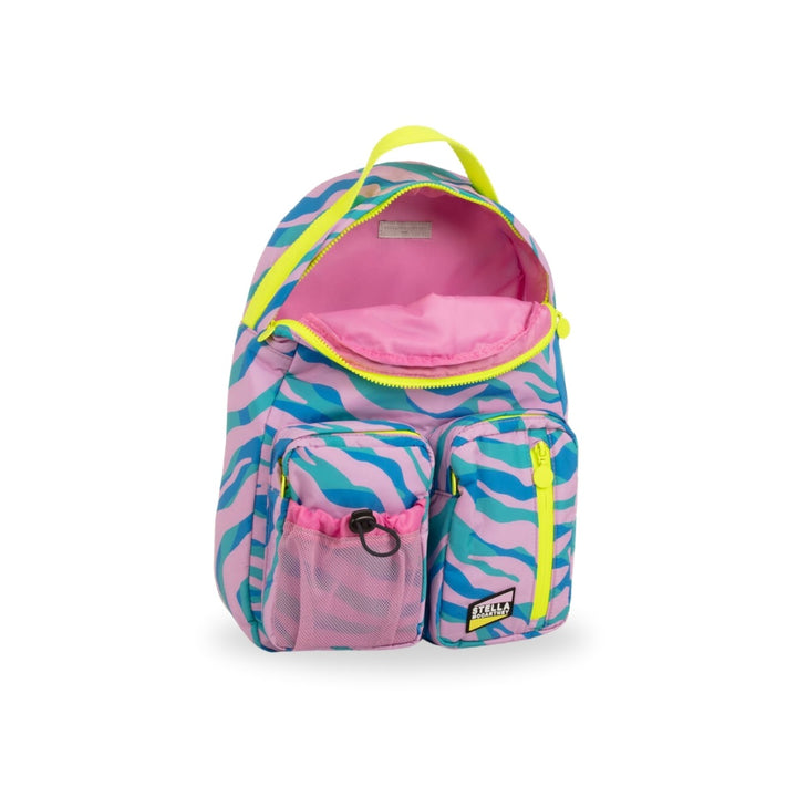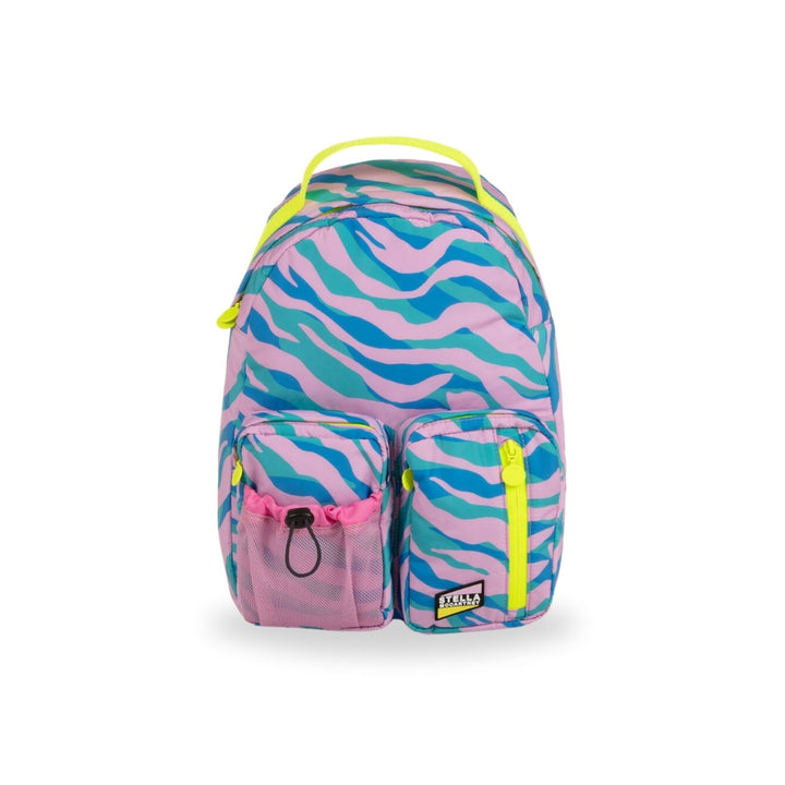 Pink and blue backpack for girls by Stella McCartney Kids, in a striking zebra print. Made using recycled materials, it has stand-out neon yellow trims on the zips and the carry handle. With plenty of space for storing belongings, this practical, fun bag has a large main compartment and smaller zip pockets on the front. A functional mesh drawstring pouch can be found on the front, adding extra storage options. Subtle logo details can be found across the piece, adding discreet designer detailing to this accessory. The adjustable, padded shoulder straps ensure comfortable wear.