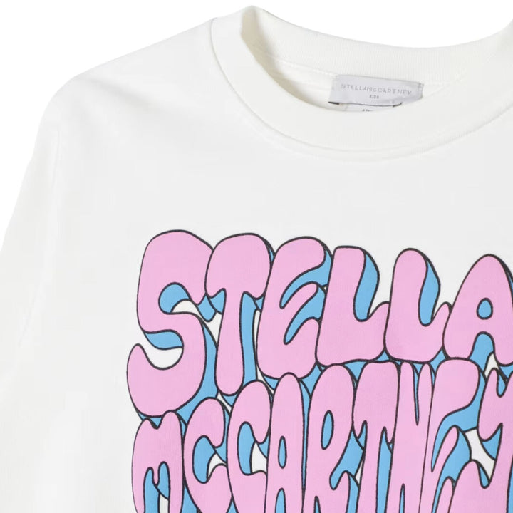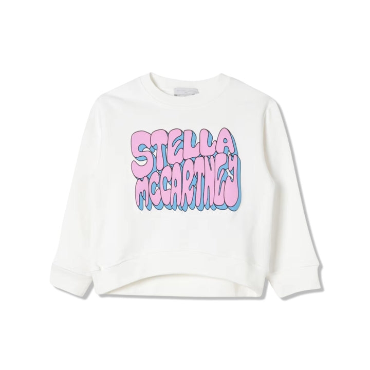 Ivory sweatshirt for girls by Stella McCartney Kids, made in soft, mid-weight organic cotton jersey with a warm fleecy inside. This casual top has cosy ribbed trims and a stylish dipped hem. There is a pink and blue logo across the front in 3D effect bubble letters for a fun retro-inspired designer finish. The Stella McCartney fit can be quite small so choose a size up if you want room to grow.