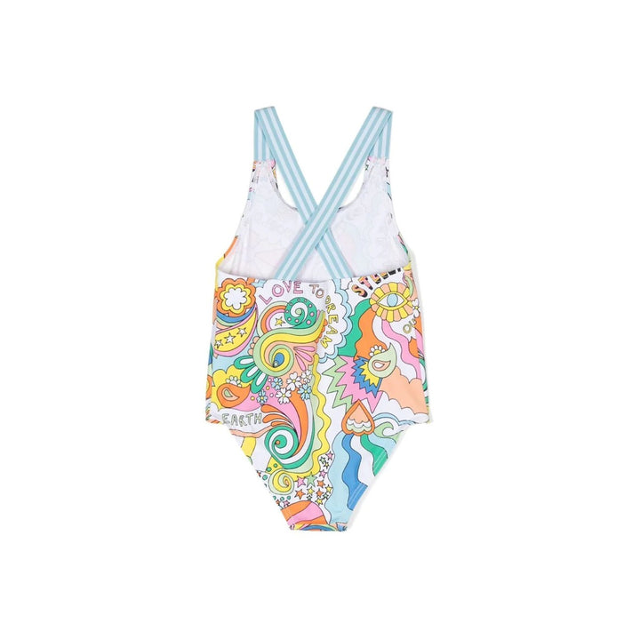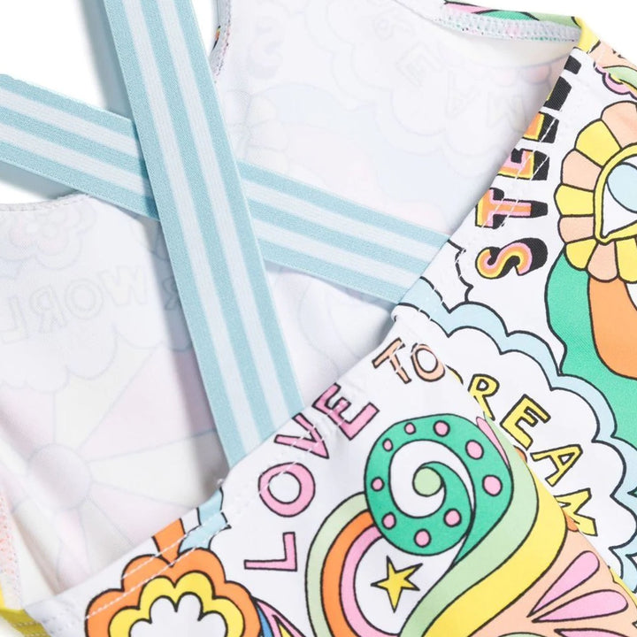 Ivory and blue swimsuit for girls from Stella McCartney Kids. With UPF 50+, this cute swimwear piece is designed with a colourful '60s-style psychedelic pattern. Amongst the retro prints is the British brand's logo for a cool designer look. Crossing over on the back, the pale blue stripy straps are elasticated for a comfortable fit and ease of dressing. Eco-conscious, it is made in silky and stretchy recycled fabric.