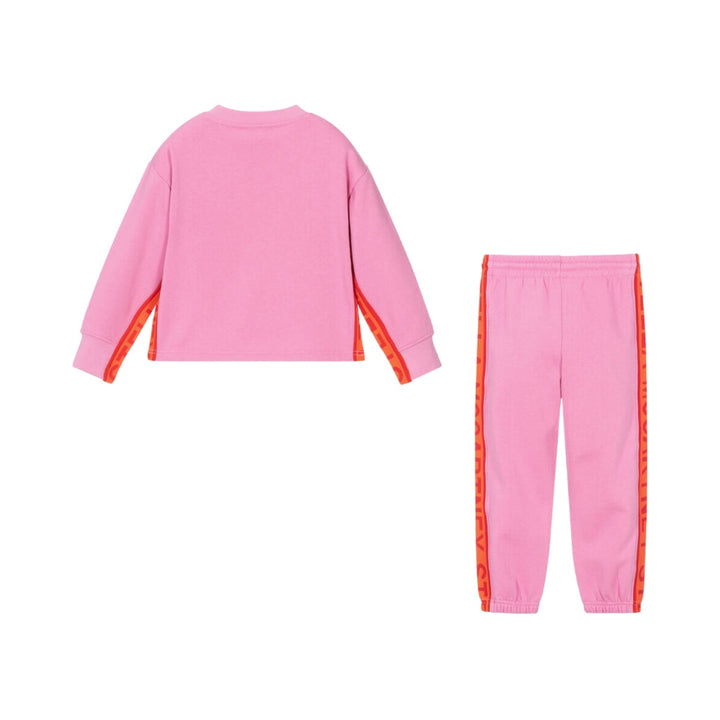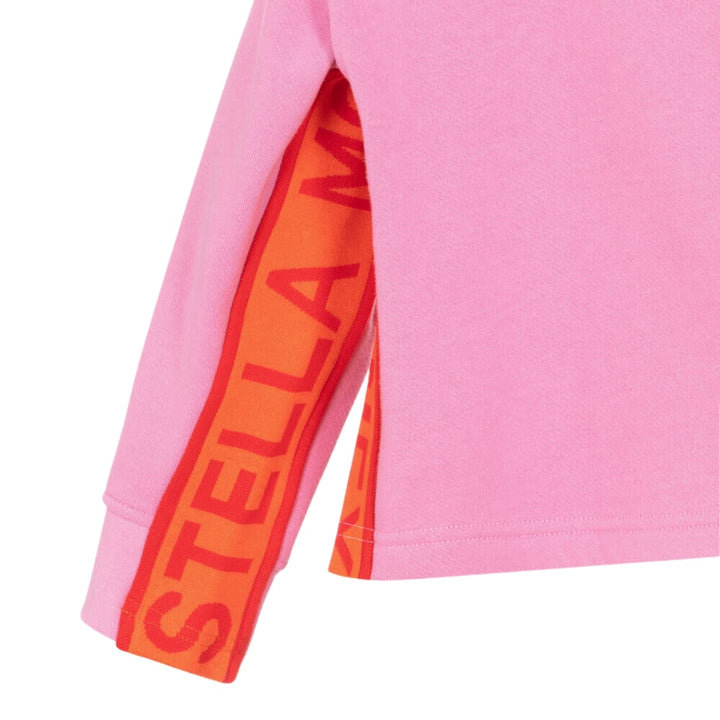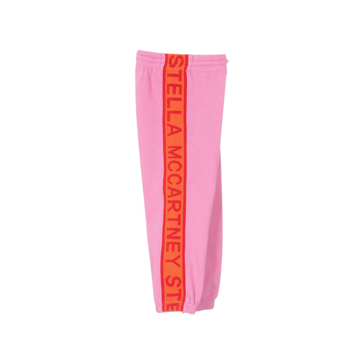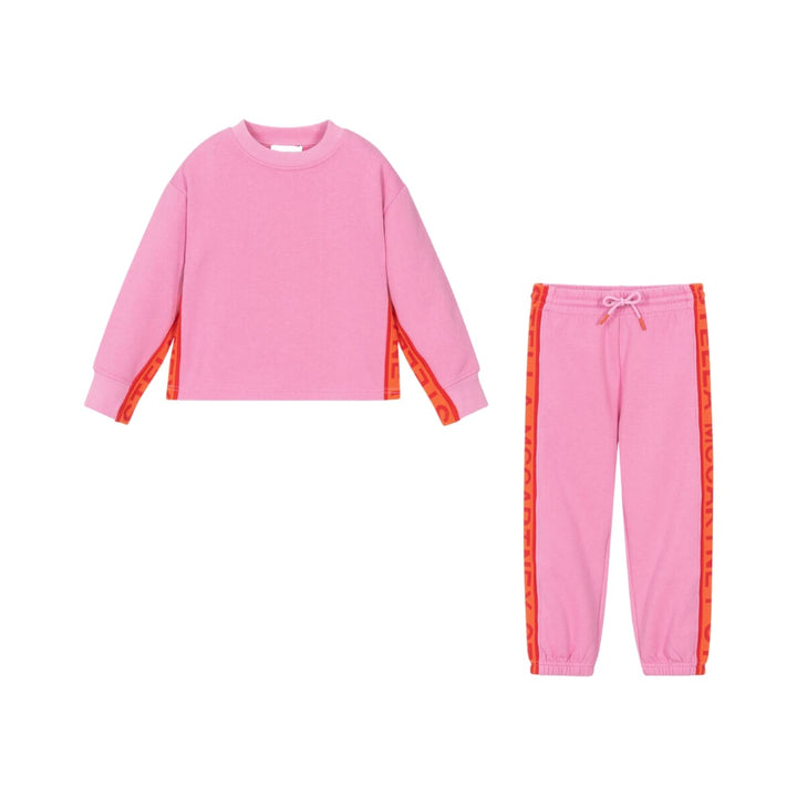 Pink tracksuit for girls by Stella McCartney Kids, made in soft, mid-weight organic cotton jersey. Ideal for lounging or sporting activities, it has a warm and cosy fleecy inside and ribbed trims. Both pieces have sporty orange and red logo tape trims on the sides. The top has a cropped, boxy fit. The matching joggers have a useful drawstring waist for a comfortable fit and elasticated cuffs. The Stella McCartney fit can be quite small so choose a size up if you want room to grow.