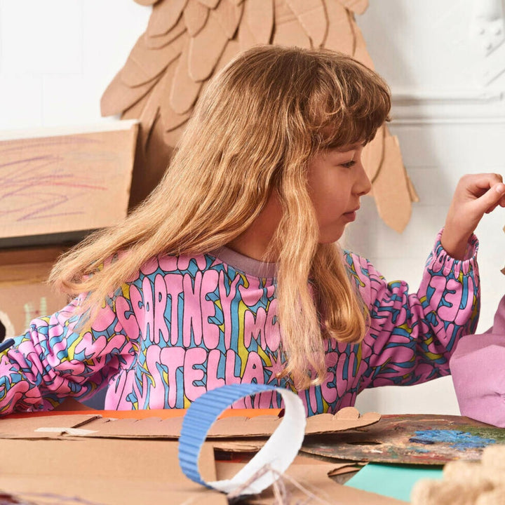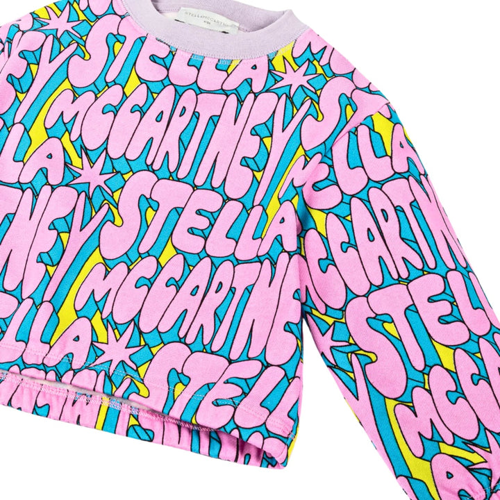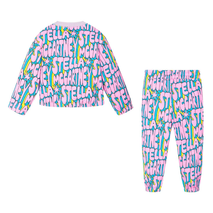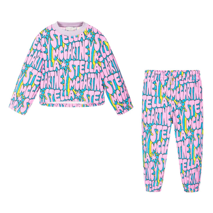 A blue and pink tracksuit for girls by Stella McCartney Kids, made from mid-weight organic cotton jersey. Patterned with the brand's logo lettering in a fun 3D bubble effect, this comfortable tracksuit has a soft and fleecy inside for extra warmth. The sweatshirt has a ribbed crew neckline and gently elasticated cuffs and hem, whilst the joggers have front pockets and a drawstring elasticated waistband to ensure a great fit. The Stella McCartney fit can be quite small so choose a size up if you want room to grow.