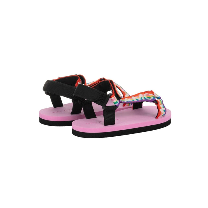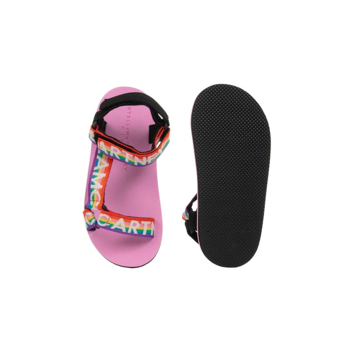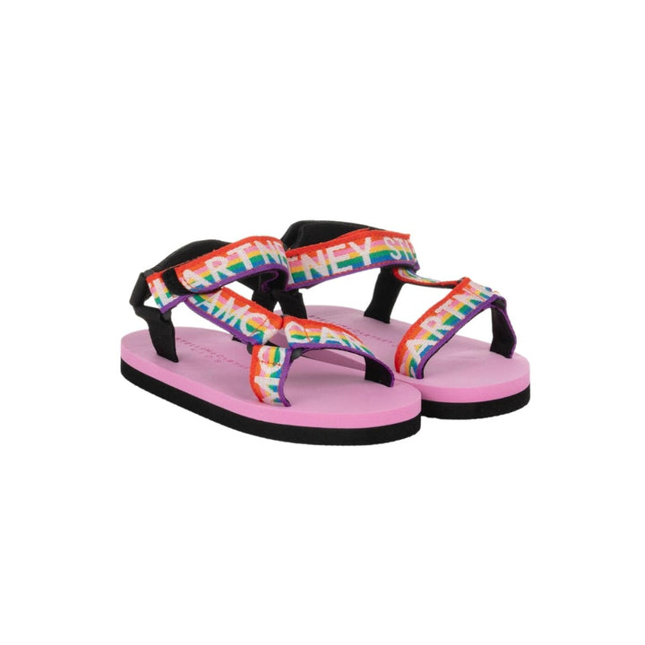 Boldly stylish, these rainbow sandals for girls are by Stella McCartney Kids. The woven straps feature a bold white logo print, with useful velcro fastenings. In contrasting pink and black, the foam soles are flexible and non-slip, ensuring ultimate comfort.