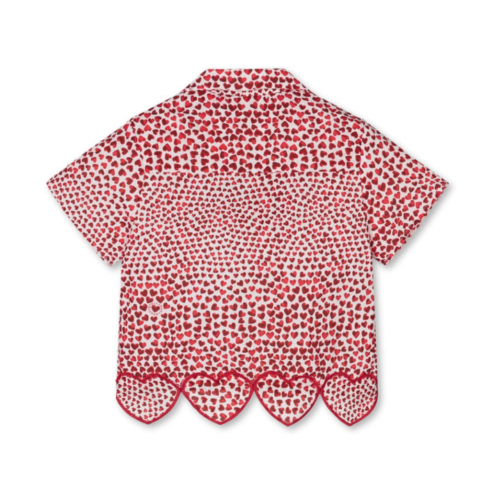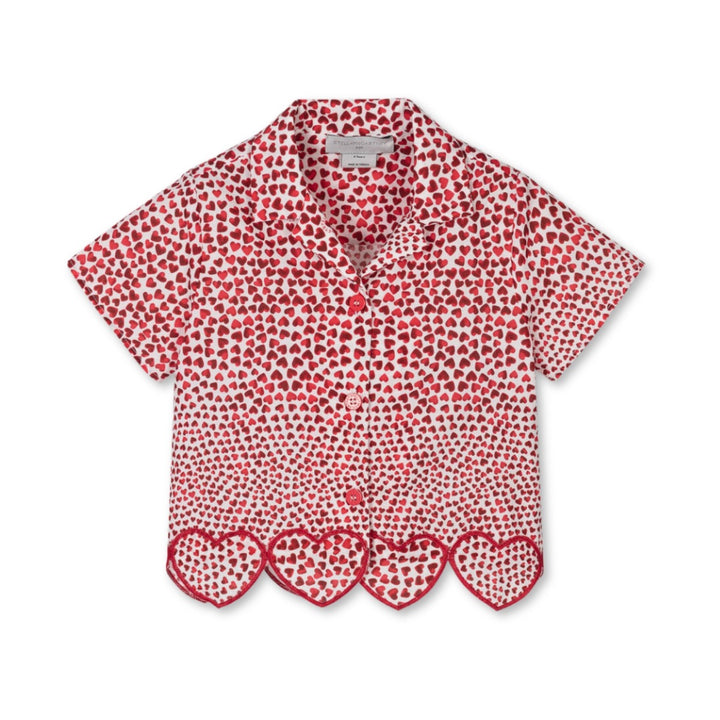 Lovely red and white short-sleeved shirt for girls by Stella McCartney Kids, made in soft organic cotton. It has a playful red heart print, with quirky heart appliqués decorating the hem. There are button fastenings on the front, each embossed with the designer's logo. The Stella McCartney fit can be quite small so choose a size up if you want room to grow.