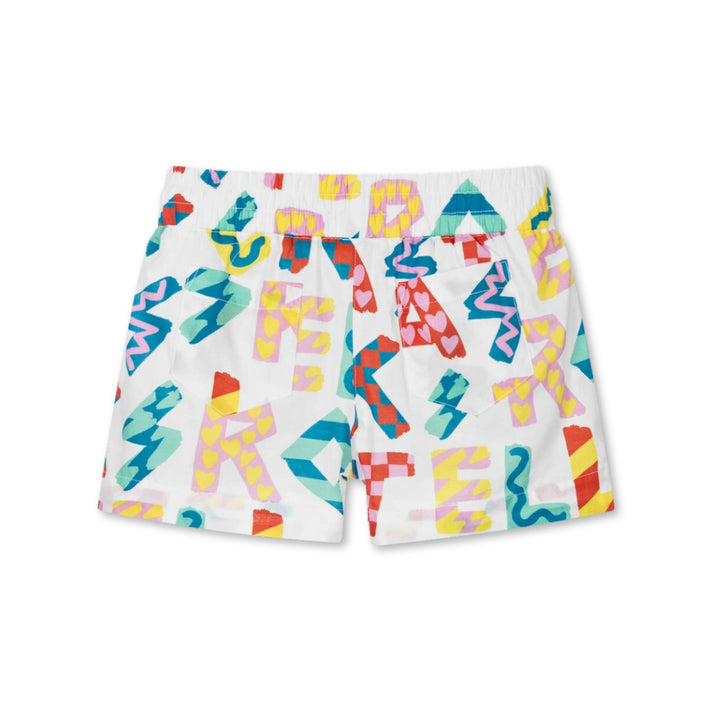 White shorts for girls by Stella McCartney Kids, made in soft organic cotton, with a lightweight voile lining for comfort. Patterned with graphic logo lettering all over for a fun, quirky look, they have slanted pockets on the front and patch pockets on the back. The Stella McCartney fit can be quite small so choose a size up if you want room to grow.