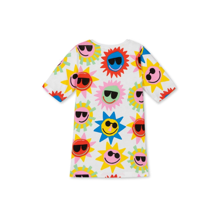 Great for warmer days, this white short-sleeved T-shirt dress for girls is by Stella McCartney Kids. Made from soft organic cotton jersey, it is printed with a bright and colourful sun graphic design for a light-hearted look. It has a fringed hem with raw edges on the front, for a fun and quirky finish. The Stella McCartney fit can be quite small so choose a size up if you want room to grow.