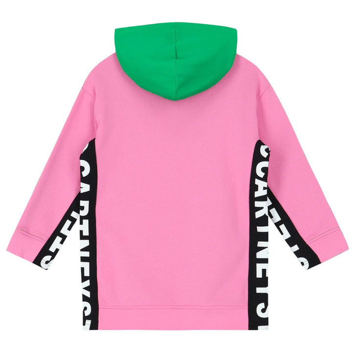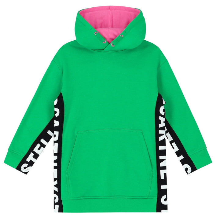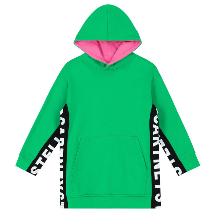Green hoodie Dress by Stella Mc Cartney with a basic design. It has a full sleeve and pocket in front. The trendiest color of all times for your little ones.