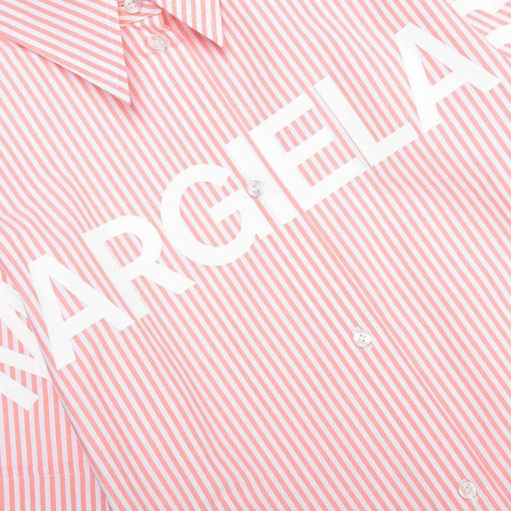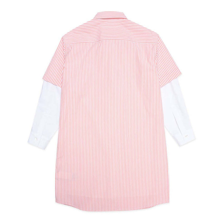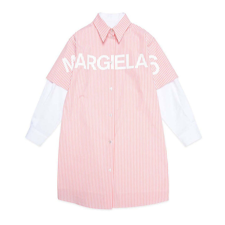 Pink cotton poplin shirt dress with vertical stripes, collar, double sleeve with a trompe-l’œil effect, and short sleeve completed by white poplin insert. Margiela 6 displaced logo detail on the front.